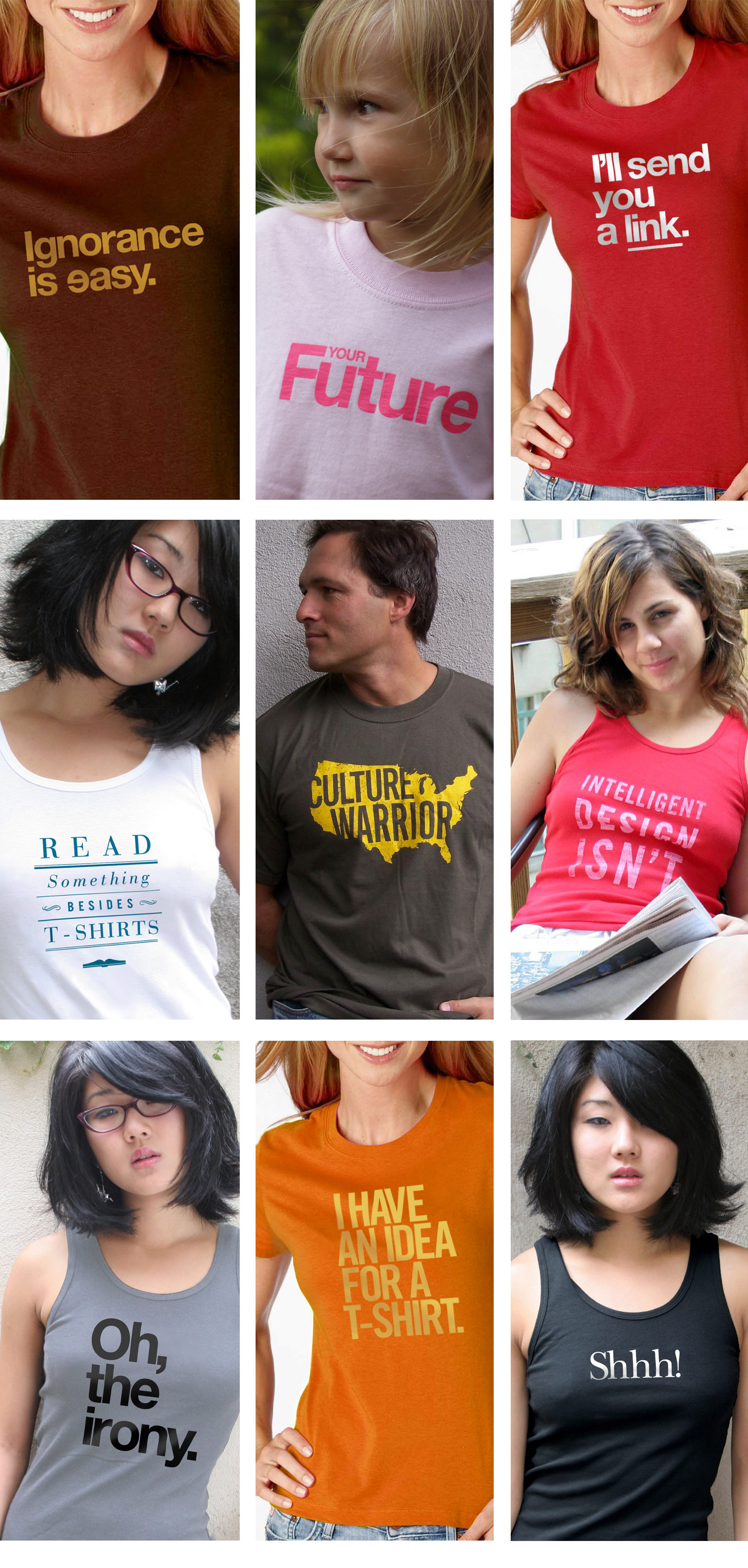 Since 2003, Progresswear has offered t-shirts addressing critical issues of our time. While the site is on hiatus, a selection of our themes is available at https://www.chopshopstore.com/collections/typographyshop